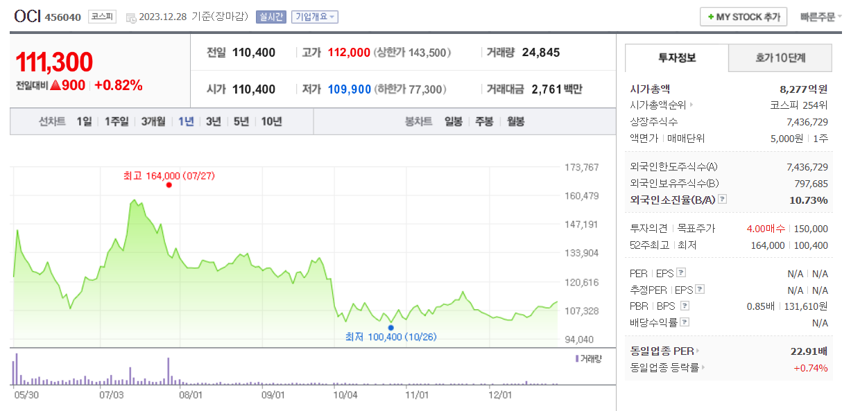 OCI 현재 주가는 111,300원이며 전일 대비 -8.70원의 모습을 보이고 있습니다. OCI의 주주현황을 살펴보면 OCI홀딩스(외 20인)이 지분 36.37%를 소유하고 있습니다. OCI는 화학 기업으로 장중 기준으로 주가는 111,300원 입니다. OCI의 시가 총액은 8277억 원이며 발행 주식수는 10.74주 입니다. 외국인 보유 비중은 24,891% 이며 장중 거래량은 7,436,729를 기록했습니다. 매출액은 7,943억 원, 영업이익은 억 원을 달성했습니다.