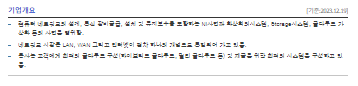 -컴퓨터 네트워크의 설계, 통신 장비공급, 설치 및 유지보수를 포함하는 NI사업과 화상회의시스템, Storage시스템, 클라우드 가상화 등의 사업을 영위함. 네트워크 시장은 LAN, WAN 그리고 인터넷이 점차 하나의 개념으로 통일되어 가고 있음. 동사는 고객에게 최적의 클라우드 구성(하이브리드 클라우드, 멀티 클라우드 등) 및 제공을 위한 최적의 시스템을 구성하고 있음.