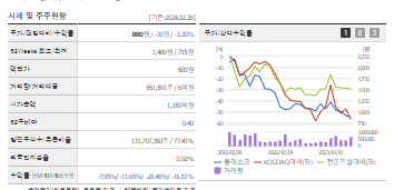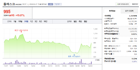 플래스크 현재 주가는 880원이며 전일 대비 -30원의 모습을 보이고 있습니다. 플래스크의 주주현황을 살펴보면 비엔엠홀딩스(외 3인)이 지분 21.67%를 소유하고 있습니다. 플래스크는 건설 기업으로 장중 기준으로 주가는 880원 입니다. 플래스크의 시가 총액은 1310억 원이며 발행 주식수는 0.92주 입니다. 외국인 보유 비중은 651,591% 이며 장중 거래량은 131,707,350를 기록했습니다. 매출액은 169억 원, 영업이익은 -135억 원을 달성했습니다. EPS는 없음원이며 플래스크 주식 배당수익률은 -42% 입니다.