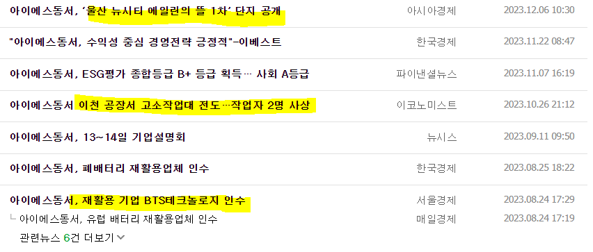 -2023년 9월 전년동기 대비 연결기준 매출액은 12.4% 감소, 영업이익은 10.6% 감소, 당기순이익은 8.8% 증가. 콘크리트부문의 2023년 당분기 생산실적은 제조금액을 기준으로 100,543백만원이며 전년 동기대비 13.89% 감소하였음. 불황인 건설업 상황에서도 동사는 환경사업(폐배터리)에 집중하여 매출 다각화롤 꾀했고 이는 당기순이익 증가로 이어짐.