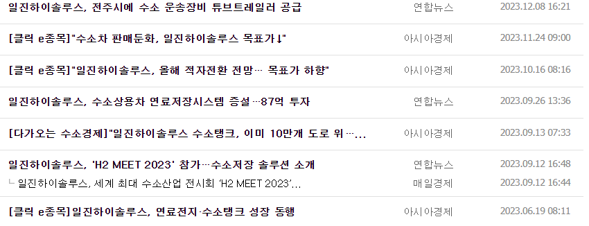 -2023년 9월 전년동기 대비 별도기준 매출액은 24.8% 감소, 영업이익 적자전환, 당기순이익은 62% 감소. 각종 비용 절감노력에도 수소사업부의 승용수소용기, 환경사업부의 매연 저감장치 매출 등이 전년동기대비 감소하여 동사의 영업이익이 적자전환됨. 국내 고객사인 현대자동차그룹과 우호적인 관계를 유지하고, 해외 고객사 발굴을 위하여 신차개발 단계부터 공동개발을 추진.