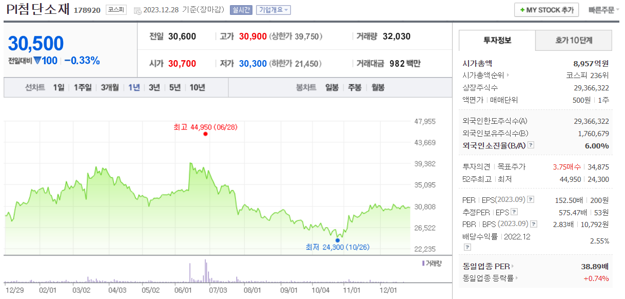 PI첨단소재 현재 주가는 30,500원이며 전일 대비 -100원의 모습을 보이고 있습니다. PI첨단소재의 주주현황을 살펴보면 아케마코리아홀딩(외 1인)이 지분 54.14%를 소유하고 있습니다. PI첨단소재는 화학 기업으로 장중 기준으로 주가는 30,500원 입니다. PI첨단소재의 시가 총액은 8957억 원이며 발행 주식수는 6.12주 입니다. 외국인 보유 비중은 32,057% 이며 장중 거래량은 29,366,322를 기록했습니다. 매출액은 1,642억 원, 영업이익은 521억 원을 달성했습니다. EPS는 53원이며 PI첨단소재 주식 배당수익률은 2.70% 입니다.
