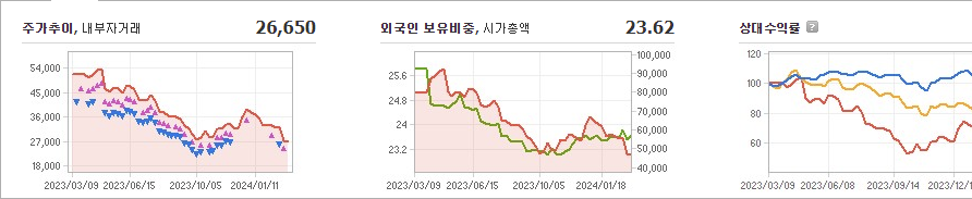 한화솔루션의 현재 주가는 26,650원이며 전일 대비 -250원으로 하락하였습니다. 주주 현황을 살펴보면 한화(외 4인)이 지분의 36.48%를 소유하고 있습니다. 한화솔루션은 에너지 시설 및 서비스 기업으로, 현재 주가는 26,650원입니다. 시가 총액은 4조 7013억 원이며 발행 주식수는 171,892,536주입니다. 외국인 보유 비중은 23.62%이며, 장중 거래량은 678,458주를 기록했습니다. 또한, 매출액은 94,190억 원을 달성했습니다.