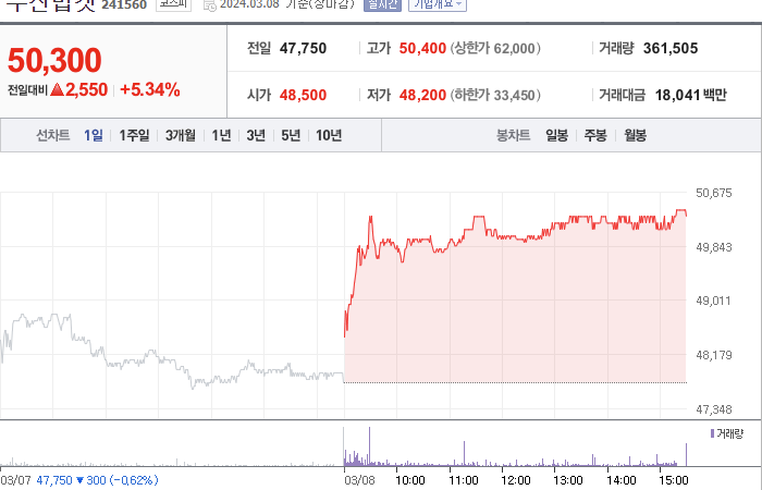 두산밥캣은 현재 주가가 47,750원이고 전일 대비 -300원의 하락세를 보이고 있습니다. 주주 현황을 살펴보면, 두산에너빌리티(외 2인)이 지분의 46.08%를 소유하고 있습니다. 두산밥캣은 기계 기업으로 시장 오픈 기준 주가는 47,750원입니다. 시가 총액은 5조 425억 원이며 발행 주식수는 100,249,166주입니다. 외국인 보유 비중은 40.24%이며 거래량은 160,770주를 기록했습니다. 또한, 두산밥캣은 매출액으로 74,433억 원을 달성했습니다.