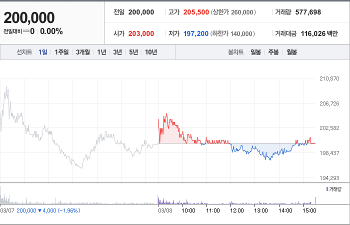한화에어로스페이스의 현재 주가는 200,000원이며 전일 대비 -4,000원의 하락세를 보이고 있습니다. 주주현황을 살펴보면 한화(외 3인)이 지분의 33.98%를 소유하고 있습니다. 한화에어로스페이스는 상업서비스 기업으로, 현재 주가는 200,000원입니다. 시가 총액은 10조1260억 원이며 발행 주식수는 50,630,000주입니다. 외국인 보유 비중은 34.85%이며, 장중 거래량은 1,018,618주를 기록했습니다. 또한, 매출액은 59,273억 원을 달성했습니다.