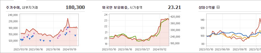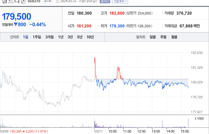 셀트리온의 현재 주가는 180,300원이고, 전일 대비 원의 모습을 보이고 있습니다. 셀트리온의 주주 구성은 셀트리온홀딩스(외 86인)이 지분의 28.15%를 소유하고 있습니다. 이 회사는 바이오 기업으로, 장중 기준으로 주가는 180,300원입니다. 셀트리온의 시가 총액은 39조1399억 원이며 발행 주식수는 218,049,762주입니다. 외국인 보유 비중은 23.21%이고, 장중 거래량은 519,400을 기록했습니다. 또한, 셀트리온은 매출액으로 17,938억 원을 달성했습니다.