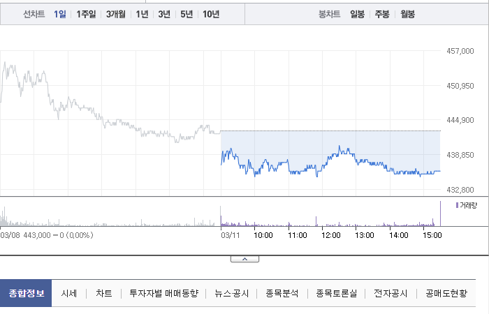 LG화학의 현재 주가는 443,000원이며 전일 대비 -5.84원의 변동을 보이고 있습니다. 주주현황을 살펴보면 LG(외 2인)이 지분의 33.37%를 소유하고 있습니다. LG화학은 화학 기업으로, 장중 기준 주가는 443,000원입니다. 시가 총액은 30조7783억 원이며 발행 주식수는 70,592,343주입니다. 외국인 보유 비중은 40.29%이며 장중 거래량은 288,423주입니다. 매출액은 421,150억 원입니다.